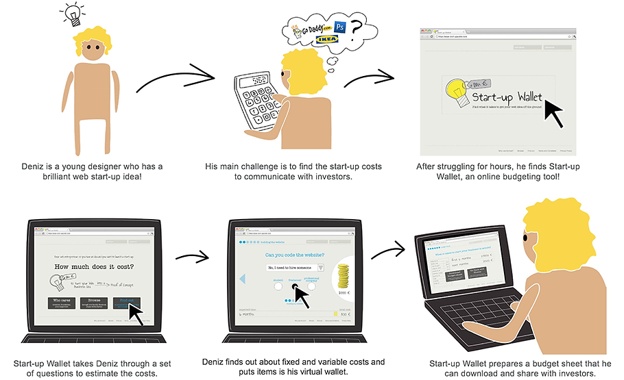 Start-up Wallet is an online tool for web entrepreneurs to calculate the total start-up cost of getting their idea off the ground. It includes all the fix and variable costs of necessary items that might or not come to the entrepreneur’s mind: such ashardware equipments, rents, license fees, recruitment costs, travel costs, etc. An entrepreneur can select among these items to drag and drop in his Virtual Wallet. Finally, he can see how they sum up to a total start-up cost.